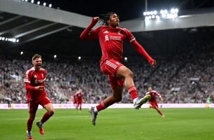Hugo Ekitike dang tay ôm Rio Ngumoha rồi nhấc bổng cậu nhóc đang cười...