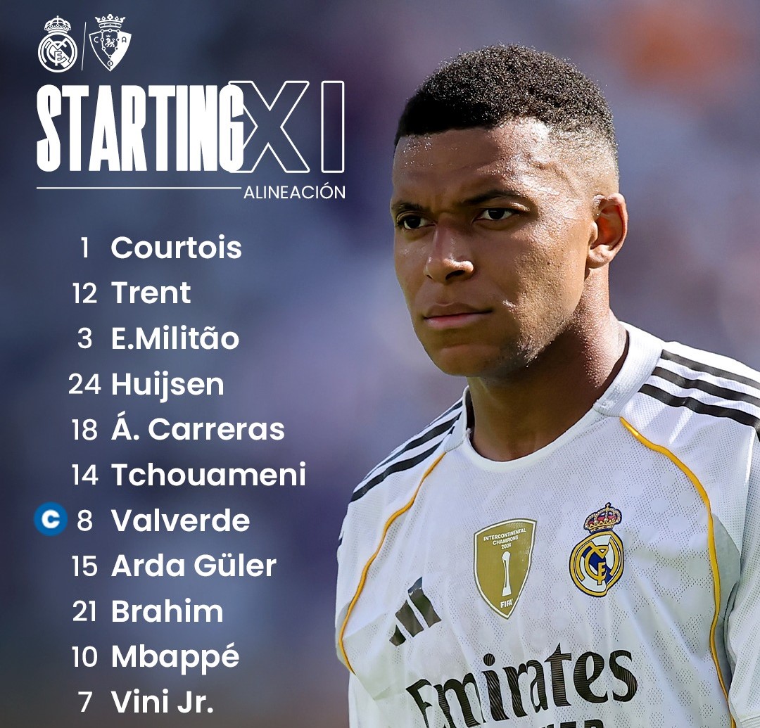 Real Madrid: Thibaut Courtois, Trent Alexander-Arnold (Carvajal 68′), Eder Militao, Dean Huijsen, Alvaro Fernandez, Federico Valverde, Aurelien Tchouameni, Arda Guler (Ceballos 90′), Brahim Díaz (Mastantuono 68′), Kylian Mbappe, Vinicius Junior (Gonzalo García 78′).