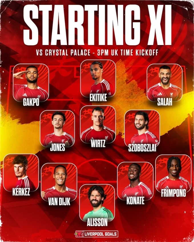 Liverpool: Alisson, Jeremie Frimpong, Ibrahima Konate, Virgil van Dijk, Milos Kerkez (Andy Robertson 84′), Curtis Jones (Wataru Endo 71′), Dominik Szoboszlai, Mohamed Salah, Florian Wirtz (Harvey Elliott 84′), Cody Gakpo, Hugo Ekitike (Mac Allister 71′).